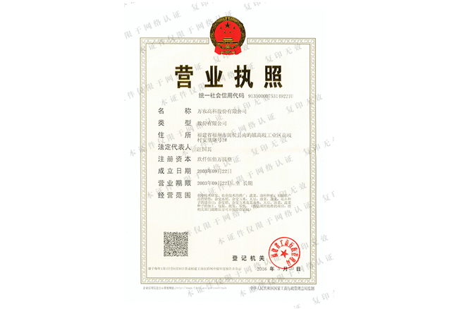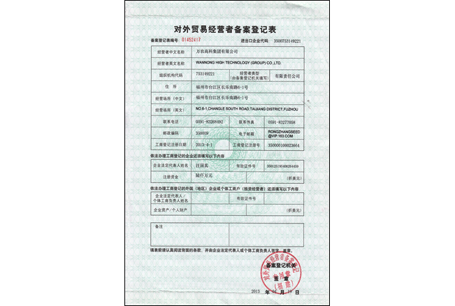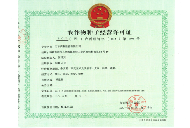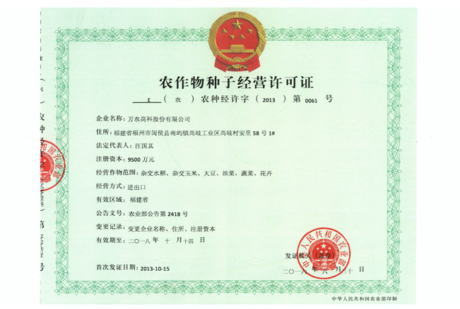 萬(wàn)農(nóng)高科集團(tuán)有限公司是福建省農(nóng)業(yè)產(chǎn)業(yè)化重點(diǎn)龍頭企業(yè)和國(guó)家高新技術(shù)企業(yè),擁有農(nóng)業(yè)部頒發(fā)的種子進(jìn)出口生產(chǎn)經(jīng)營(yíng)許可證。